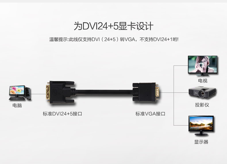 DVI输入,VGA输出。 例如:DVI的电脑显卡转到VGA的电视机上。 如果接反了,会使用不了哦。详细介绍,请看详情哦