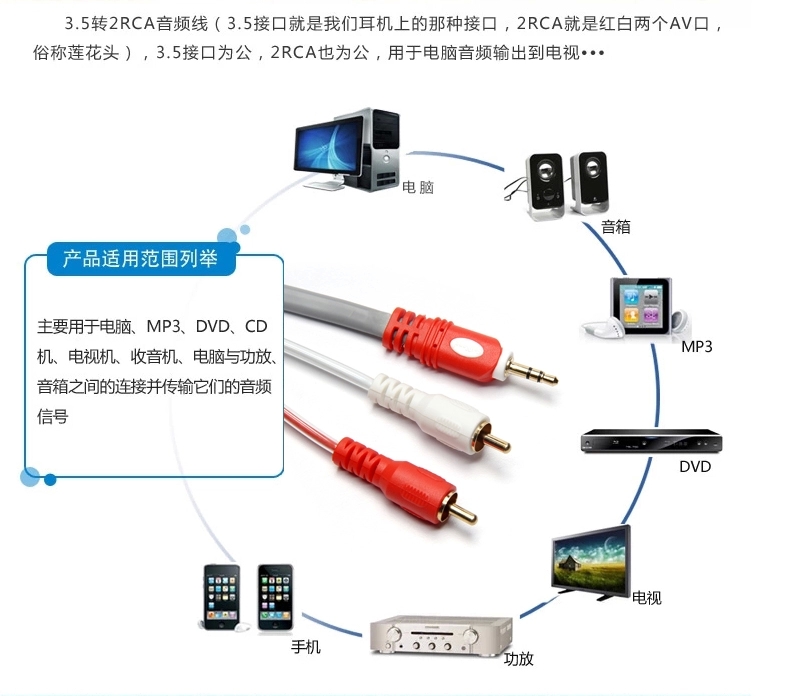 音频线一分二 工程级 3.5转2RCA双莲花音箱响线