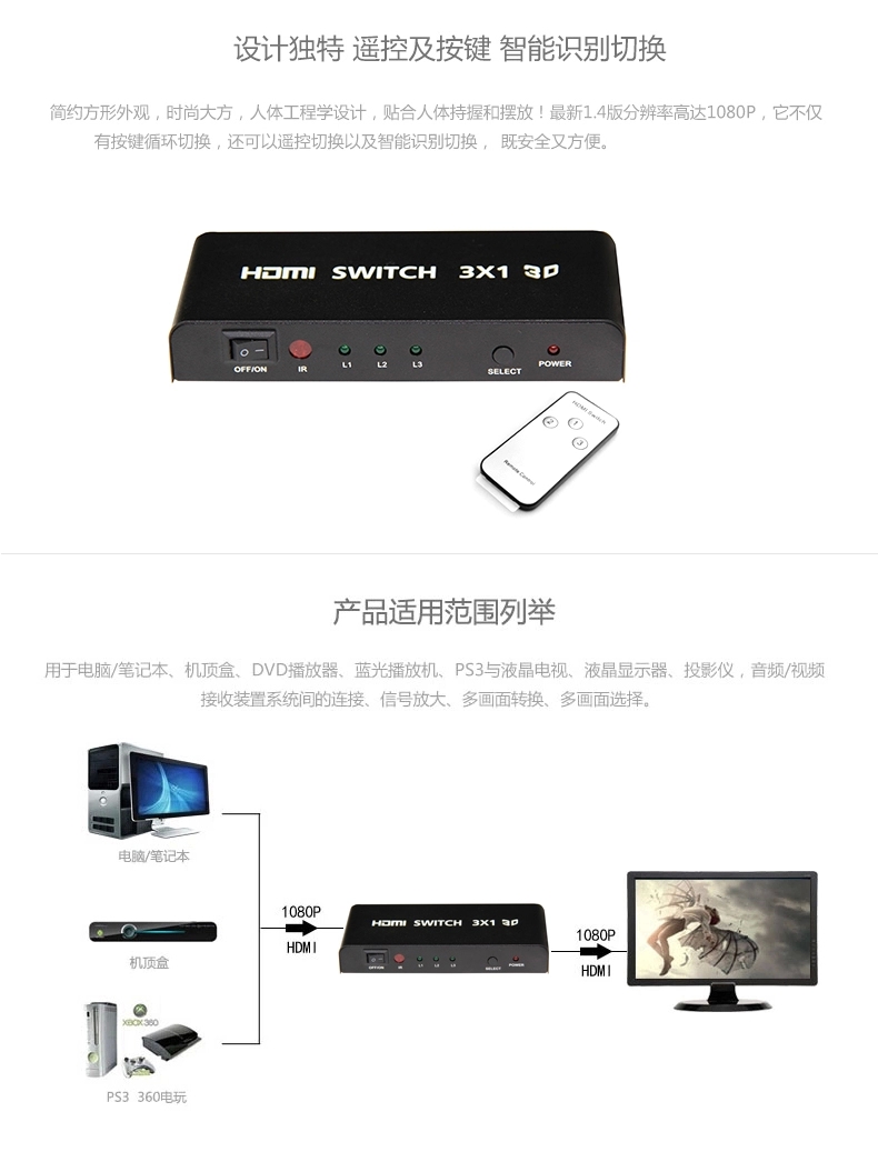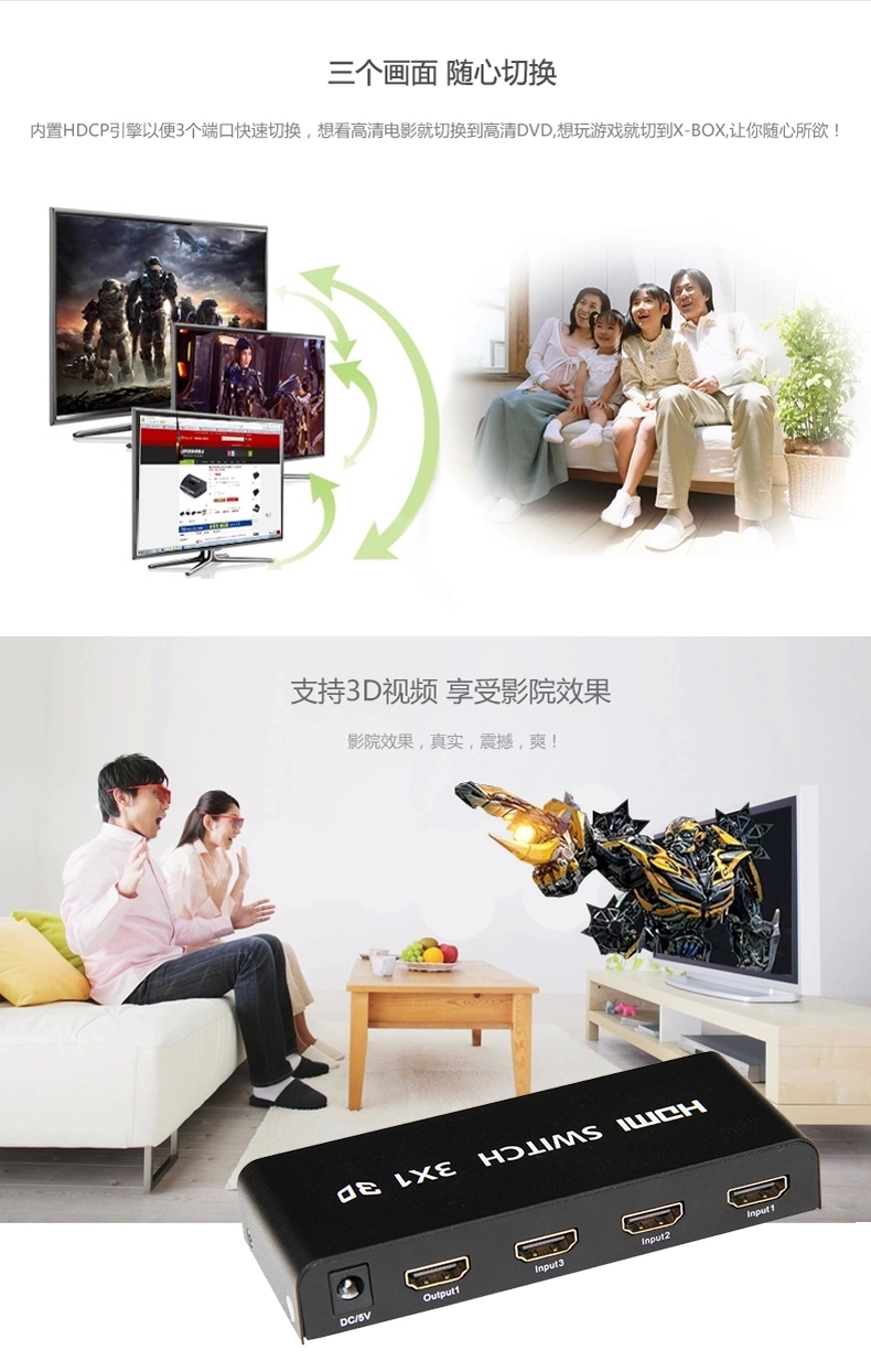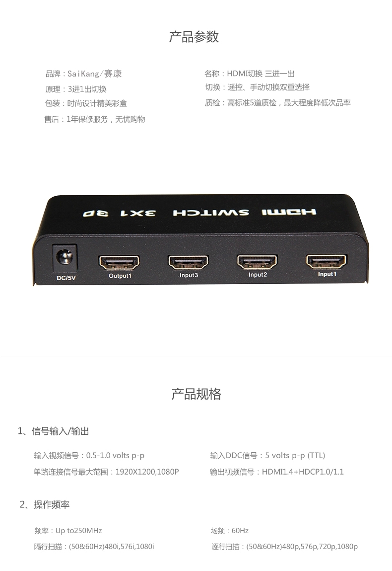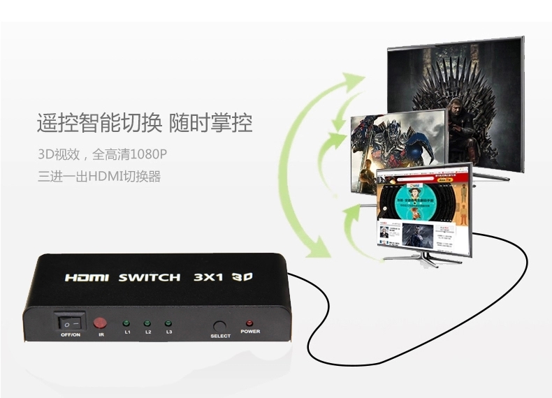 赛康 HDMI切换器 3进1出hdmi分配器三进一出高清视频转换器带遥控